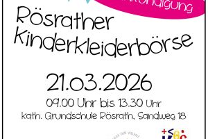 Nov. 15 2025 Rösrather Kinderkleiderbörse 2026 Die nächste Kinderkleiderbörse findet am 21.03.2026 in der kath. Grundschule Rösrath statt. Rösrather Kinderkleiderbörse 2026 Read More »