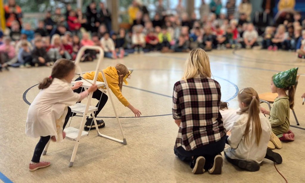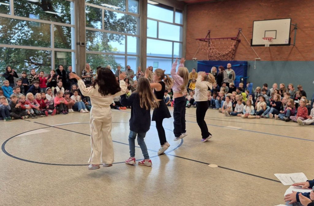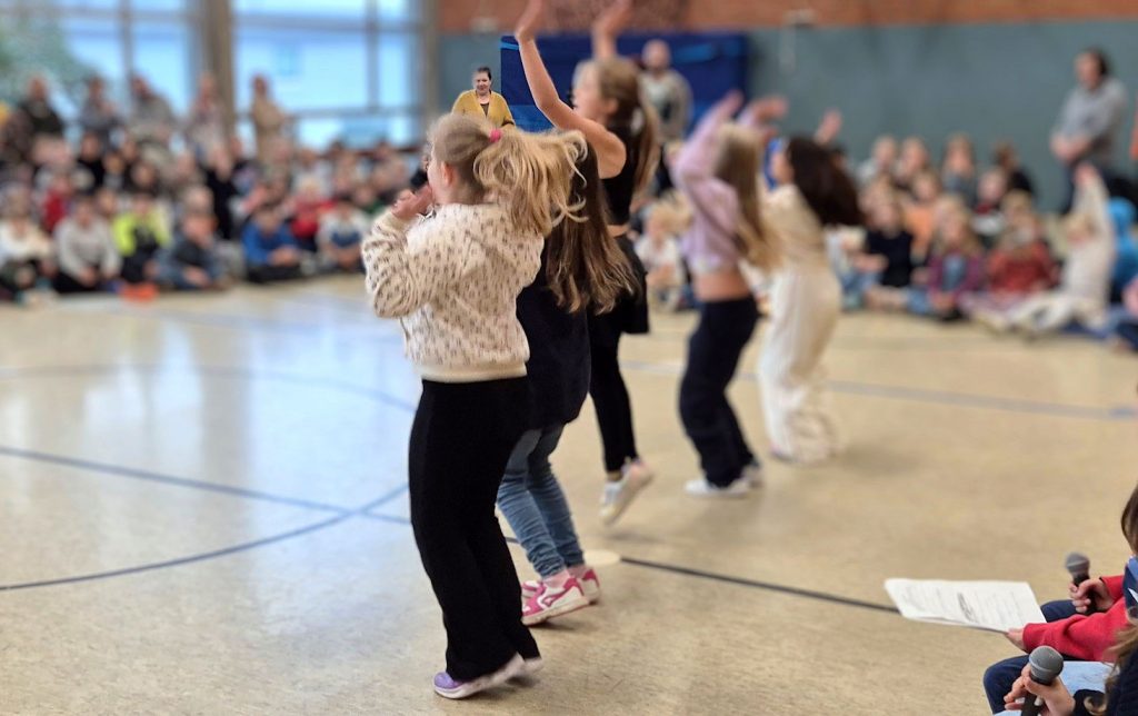 Für ordentlich Rhythmus sorgte ein Kind von den Wölfen mit dem „Cup Song“ – Toll, was für Geräusche man mit einem Becher machen kann. Musikalisch ging es weiter. Der Rap „The Spark“ vorgetragen von den Eulen und Giraffen brachte richtig Schwung in die Turnhalle und wurde von vielen Kindern aus dem Publikum mitgesungen.